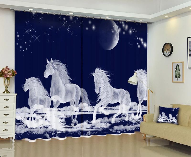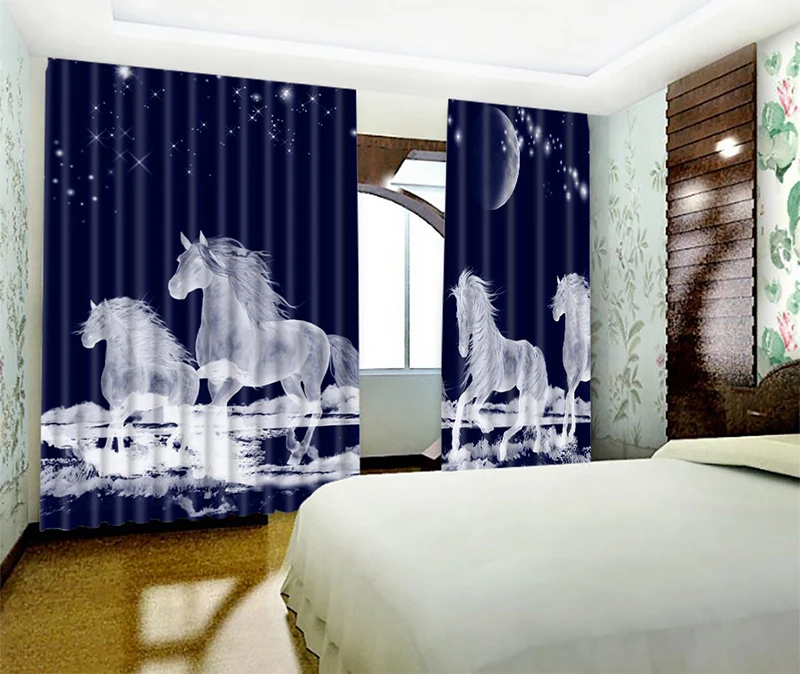 High-definition Stereo Blue Horse Digital Printed Curtains Blocking Cloth Curtains Photos Curtains